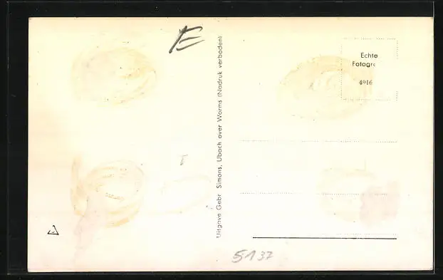 Personenbezogene Daten auf der Rückseite der Karte wurden durch blauen Textmarker unkenntlich gemacht. Die blauen Stellen sind auf die Vorderseite durchgeweicht und wirken sich negativ auf das Postkartenfoto aus