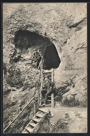 AK Türkenloch, Steinwandklamm, Wanderer am Eingang zur Höhle