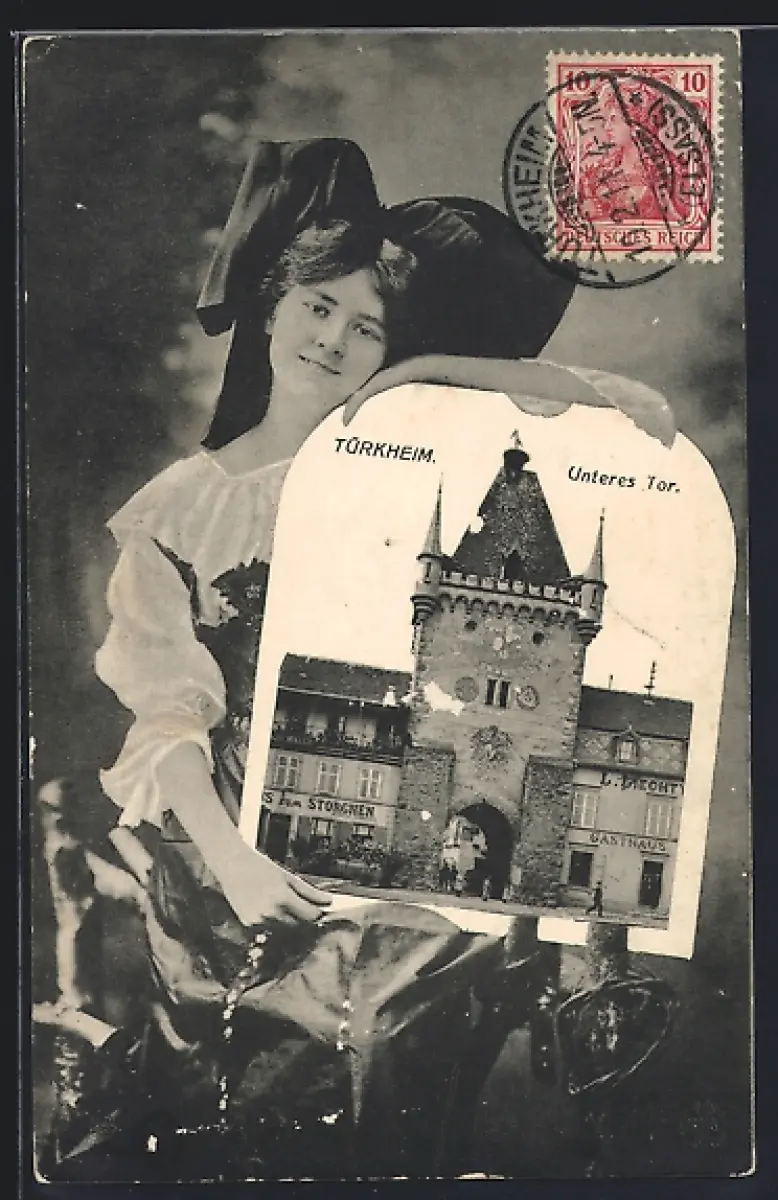AK Türkheim, Unteres Tor mit Frau in Tracht