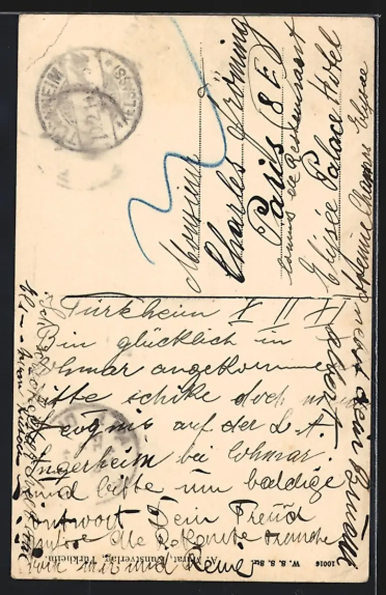 Personenbezogene Daten auf der Rückseite der Karte wurden durch blauen Textmarker unkenntlich gemacht. Die blauen Stellen sind auf die Vorderseite durchgeweicht und wirken sich negativ auf das Postkartenfoto aus