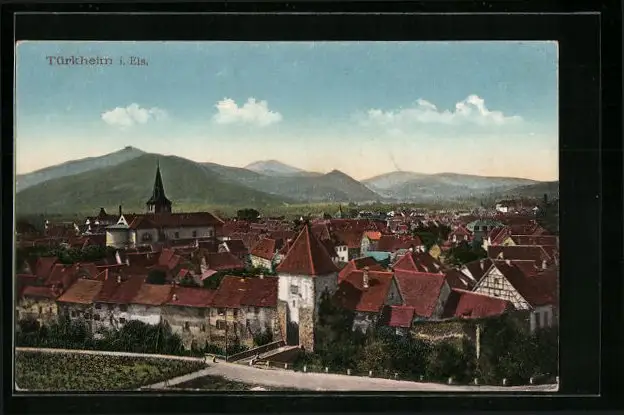 AK Türkheim, Unteres Tor mit der Fechtbrücke, Ortsansicht aus der Vogelschau