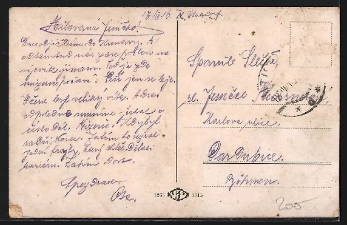 gelaufen 1916, Briefmarke entfernt, Eckknick re. unten, guter Zustand