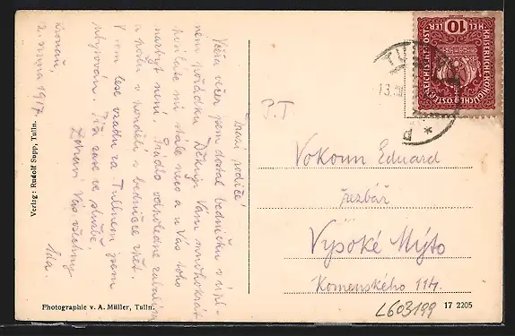 Personenbezogene Daten auf der Rückseite der Karte wurden durch blauen Textmarker unkenntlich gemacht. Die blauen Stellen sind auf die Vorderseite durchgeweicht und wirken sich negativ auf das Postkartenfoto aus