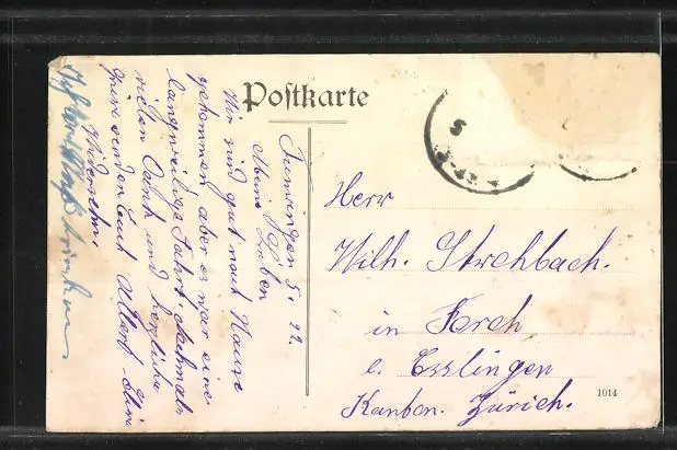 Personenbezogene Daten auf der Rückseite der Karte wurden durch blauen Textmarker unkenntlich gemacht. Die blauen Stellen sind auf die Vorderseite durchgeweicht und wirken sich negativ auf das Postkartenfoto aus