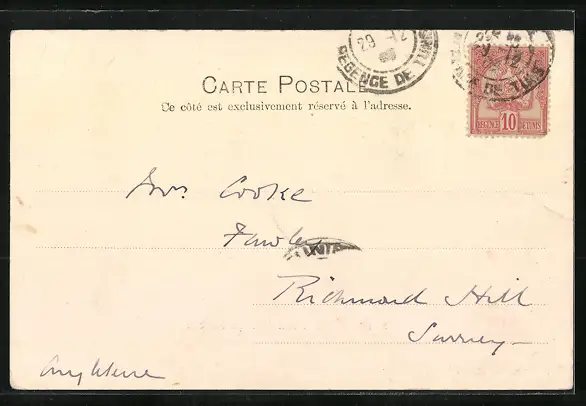 Personenbezogene Daten auf der Rückseite der Karte wurden durch blauen Textmarker unkenntlich gemacht. Die blauen Stellen sind auf die Vorderseite durchgeweicht und wirken sich negativ auf das Postkartenfoto aus
