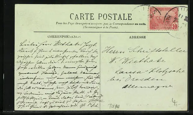 Personenbezogene Daten auf der Rückseite der Karte wurden durch blauen Textmarker unkenntlich gemacht. Die blauen Stellen sind auf die Vorderseite durchgeweicht und wirken sich negativ auf das Postkartenfoto aus