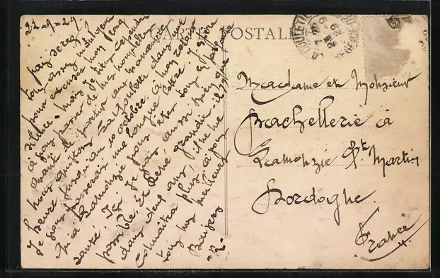 Personenbezogene Daten auf der Rückseite der Karte wurden durch blauen Textmarker unkenntlich gemacht. Die blauen Stellen sind auf die Vorderseite durchgeweicht und wirken sich negativ auf das Postkartenfoto aus