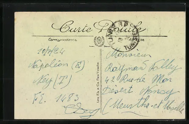 Personenbezogene Daten auf der Rückseite der Karte wurden durch blauen Textmarker unkenntlich gemacht. Die blauen Stellen sind auf die Vorderseite durchgeweicht und wirken sich negativ auf das Postkartenfoto aus