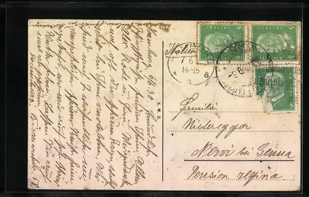 Personenbezogene Daten auf der Rückseite der Karte wurden durch blauen Textmarker unkenntlich gemacht. Die blauen Stellen sind auf die Vorderseite durchgeweicht und wirken sich negativ auf das Postkartenfoto aus