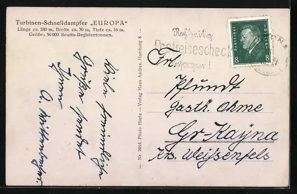 AK Turbinen-Schnelldampfer Europa macht Fahrt