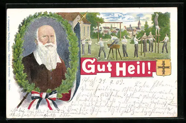 AK Turner mit Reck und Barren, Turnvater Jahn im Ehrenkranz