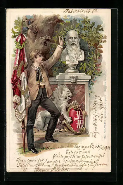 AK Turner mit einer Fahne neben einer Büste von Turnvater Jahn