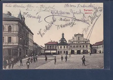 AK Turnov Namesti, gelaufen von 1906, leider wurde die Briefmarke entfernt.