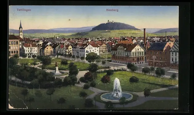 AK Tuttlingen, Ortsansicht mit Springbrunnen und Blick hinüber zum Honberg