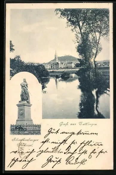 AK Tuttlingen, Uferpartie mit Kirche, Schneckenburger Denkmal