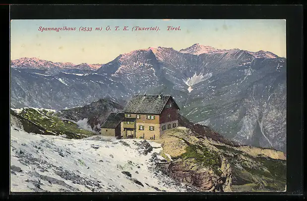 AK Tuxertal /Tirol, Spannagelhaus auf verschneitem Gipfel