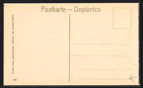Personenbezogene Daten auf der Rückseite der Karte wurden durch blauen Textmarker unkenntlich gemacht. Die blauen Stellen sind auf die Vorderseite durchgeweicht und wirken sich negativ auf das Postkartenfoto aus