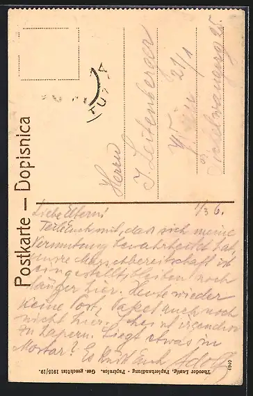 alte Ansichtskarte, gelaufen, Briefmarke entfernt, rückseitig Oberflächenschaden, guter Zustand