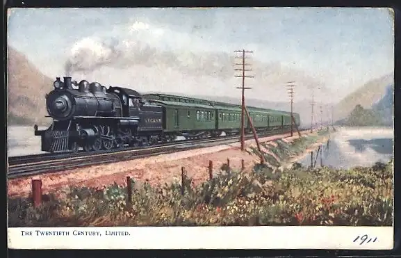 AK Twentieth Century, Limited, Eisenbahn unter Dampf an Wasser