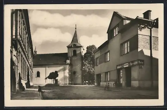 AK Týnec nad Labem, Strassenpartie mit Kirche