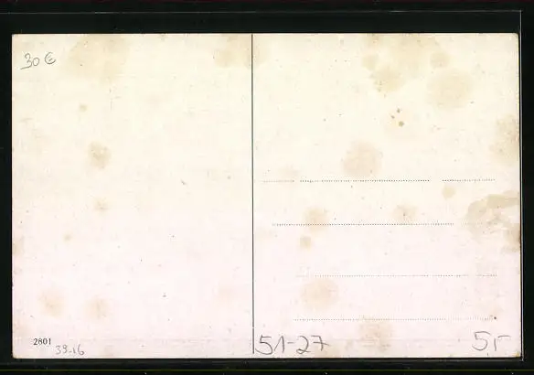 Personenbezogene Daten auf der Rückseite der Karte wurden durch blauen Textmarker unkenntlich gemacht. Die blauen Stellen sind auf die Vorderseite durchgeweicht und wirken sich negativ auf das Postkartenfoto aus