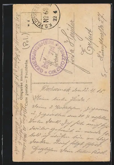Personenbezogene Daten auf der Rückseite der Karte wurden durch blauen Textmarker unkenntlich gemacht. Die blauen Stellen sind auf die Vorderseite durchgeweicht und wirken sich negativ auf das Postkartenfoto aus