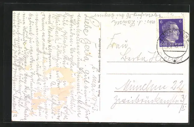Personenbezogene Daten auf der Rückseite der Karte wurden durch blauen Textmarker unkenntlich gemacht. Die blauen Stellen sind auf die Vorderseite durchgeweicht und wirken sich negativ auf das Postkartenfoto aus
