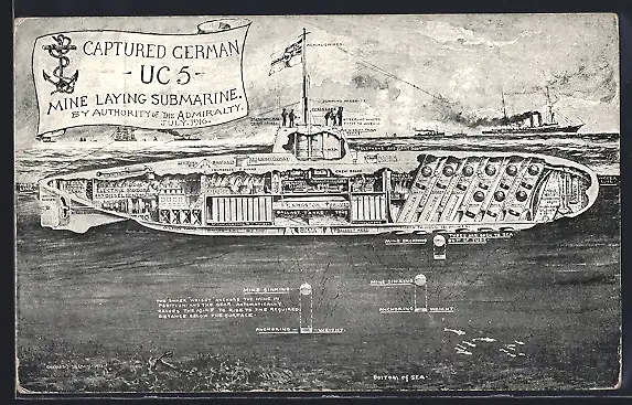 AK U-Boot Captured German UC 5 Mine Laying Submarine, Aufbau und Innenansicht