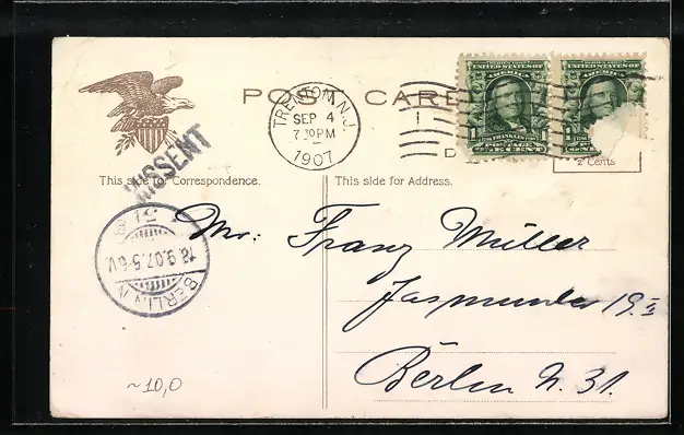 gelaufen 1907, Briefmarke entfernt, guter Zustand