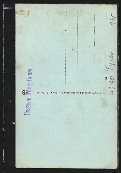 Personenbezogene Daten auf der Rückseite der Karte wurden durch blauen Textmarker unkenntlich gemacht. Die blauen Stellen sind auf die Vorderseite durchgeweicht und wirken sich negativ auf das Postkartenfoto aus