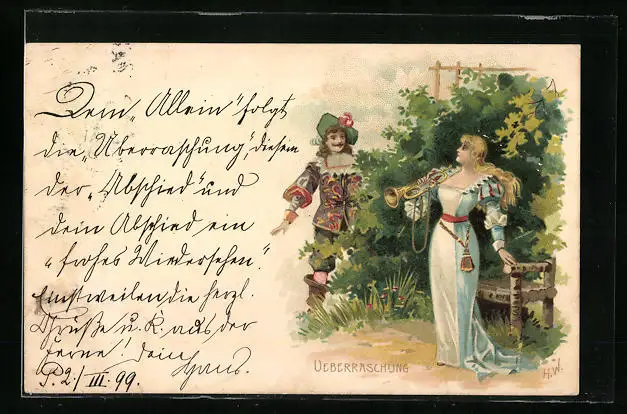 AK Überraschung, Mann und Frau mit Trompete