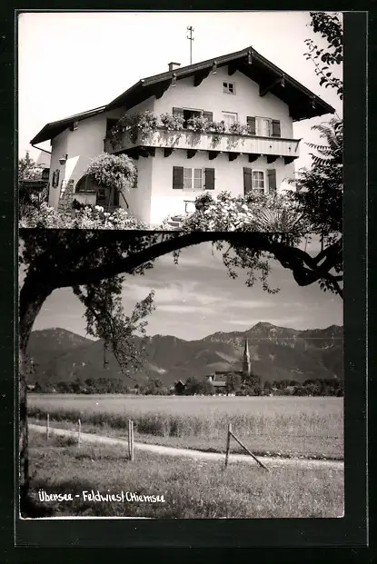 AK Übersee-Feldwies /Chiemsee, Blick zur Kirche, Wohnhaus