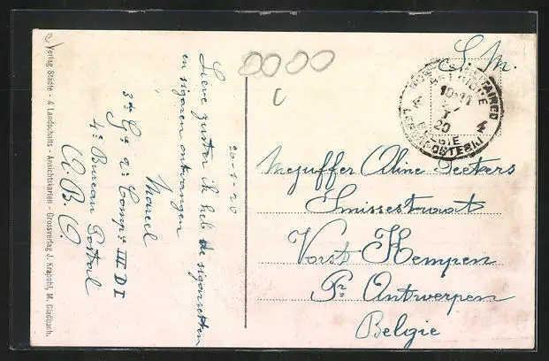 Personenbezogene Daten auf der Rückseite der Karte wurden durch blauen Textmarker unkenntlich gemacht. Die blauen Stellen sind auf die Vorderseite durchgeweicht und wirken sich negativ auf das Postkartenfoto aus