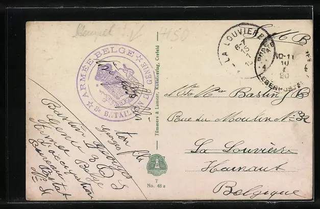 Personenbezogene Daten auf der Rückseite der Karte wurden durch blauen Textmarker unkenntlich gemacht. Die blauen Stellen sind auf die Vorderseite durchgeweicht und wirken sich negativ auf das Postkartenfoto aus