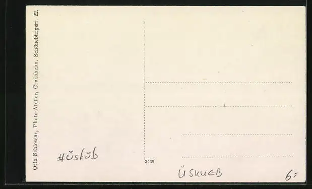 Personenbezogene Daten auf der Rückseite der Karte wurden durch blauen Textmarker unkenntlich gemacht. Die blauen Stellen sind auf die Vorderseite durchgeweicht und wirken sich negativ auf das Postkartenfoto aus