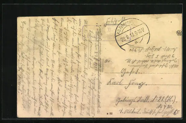 gelaufen 1917, Briefmarke entfernt, Eckknick li. oben, guter Zustand