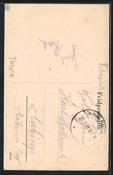 Personenbezogene Daten auf der Rückseite der Karte wurden durch blauen Textmarker unkenntlich gemacht. Die blauen Stellen sind auf die Vorderseite durchgeweicht und wirken sich negativ auf das Postkartenfoto aus