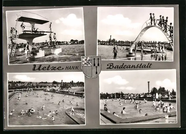 AK Uetze /Hann., Badeanstalt, Wappen, Sprungturm, Wasserrutsche
