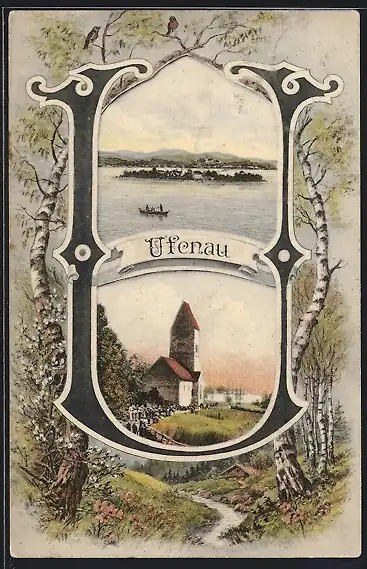 AK Ufenau, Ansicht der Insel mit Rappenswil aus der Ferne, Buchstabe U