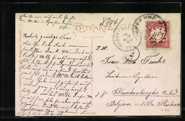 Personenbezogene Daten auf der Rückseite der Karte wurden durch blauen Textmarker unkenntlich gemacht. Die blauen Stellen sind auf die Vorderseite durchgeweicht und wirken sich negativ auf das Postkartenfoto aus