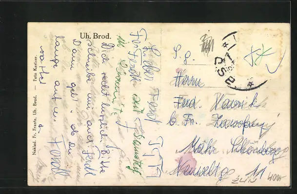 Personenbezogene Daten auf der Rückseite der Karte wurden durch blauen Textmarker unkenntlich gemacht. Die blauen Stellen sind auf die Vorderseite durchgeweicht und wirken sich negativ auf das Postkartenfoto aus