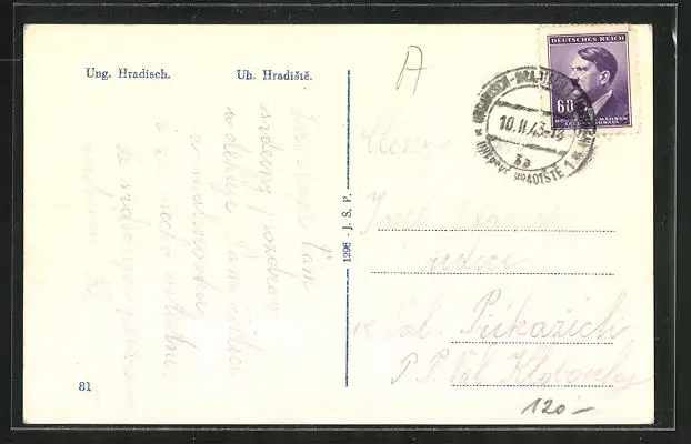 Personenbezogene Daten auf der Rückseite der Karte wurden durch blauen Textmarker unkenntlich gemacht. Die blauen Stellen sind auf die Vorderseite durchgeweicht und wirken sich negativ auf das Postkartenfoto aus
