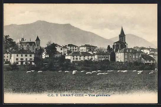 AK Uhart-Cize, Vue générale avec église et maisons devant une montagne