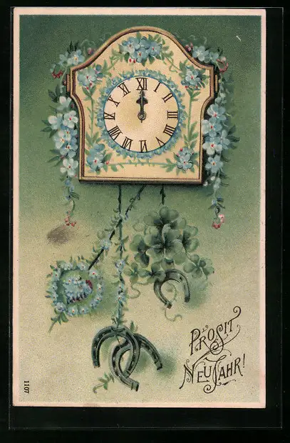 AK Uhr mit glückbringendem Hufeisen, Prosit Neujahr