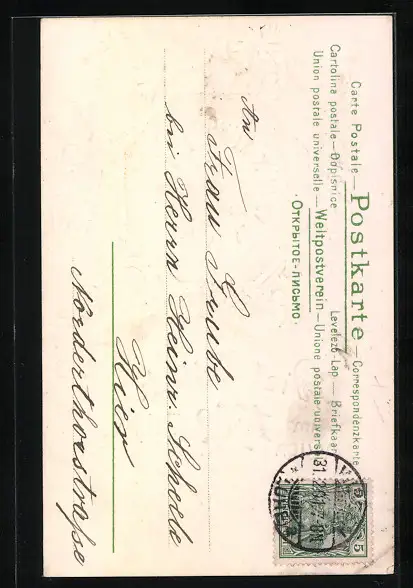 gelaufen 1901, Eckknick unten links, Bugspur oben rechts, guter Zustand