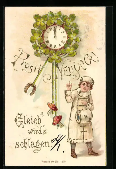 AK Uhr zu Mitternacht mit Kleeblättern