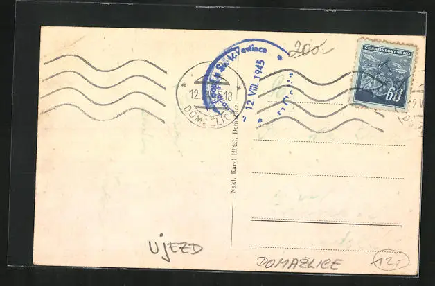 Personenbezogene Daten auf der Rückseite der Karte wurden durch blauen Textmarker unkenntlich gemacht. Die blauen Stellen sind auf die Vorderseite durchgeweicht und wirken sich negativ auf das Postkartenfoto aus