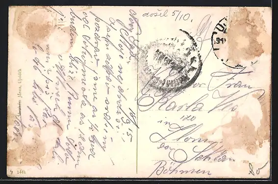 Personenbezogene Daten auf der Rückseite der Karte wurden durch blauen Textmarker unkenntlich gemacht. Die blauen Stellen sind auf die Vorderseite durchgeweicht und wirken sich negativ auf das Postkartenfoto aus