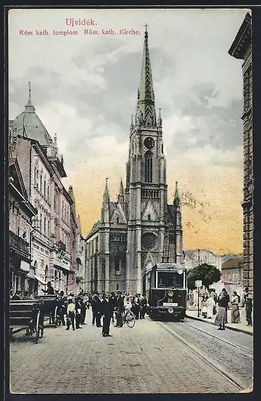 AK Ujvidék, Röm. kath. Kirche mit Strassenbahn