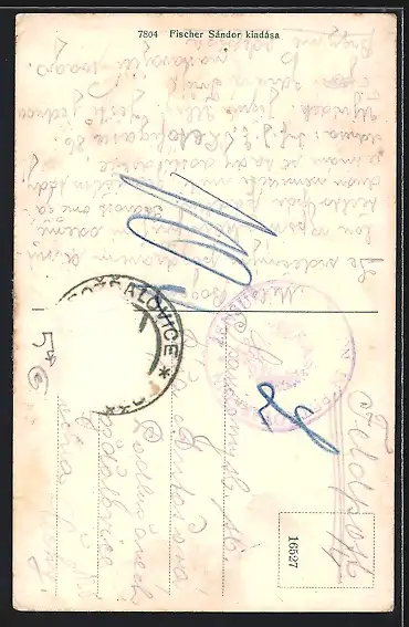 Personenbezogene Daten auf der Rückseite der Karte wurden durch blauen Textmarker unkenntlich gemacht. Die blauen Stellen sind auf die Vorderseite durchgeweicht und wirken sich negativ auf das Postkartenfoto aus